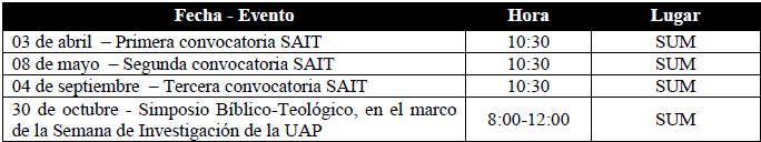 La SAIT convocará a 3 reuniones por año (dos en el primer cuatrimestre y una en el segundo)*. Este espacio será destinado principalmente a la expocisión de avances en materia de investigación por parte de profesores y alumnos de la Facultad de Teología de la UAP, pudiendo contar también con otros profesionales y docentes invitados.